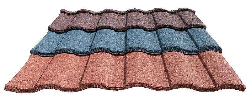 蛭石金屬瓦是以高耐腐的鍍鋁鋅鋼板為基材,以高品質的水性丙烯酸樹脂為粘合劑,以高耐候的天然彩石顆粒或無機顏料染色的天然石礫為層面,經特殊工藝加工制成的新一代金屬屋面材料,是創新型、復合型、環保型高科技產品。